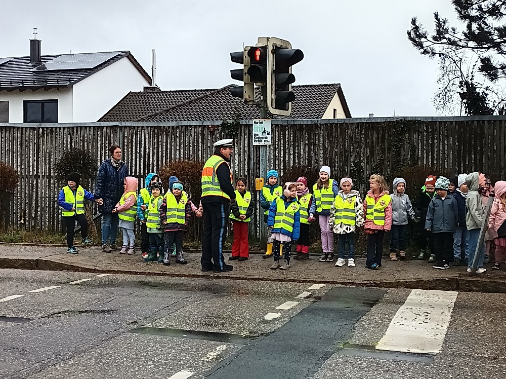 Vorschulkindern die Verkehrsregeln besprach und übte.